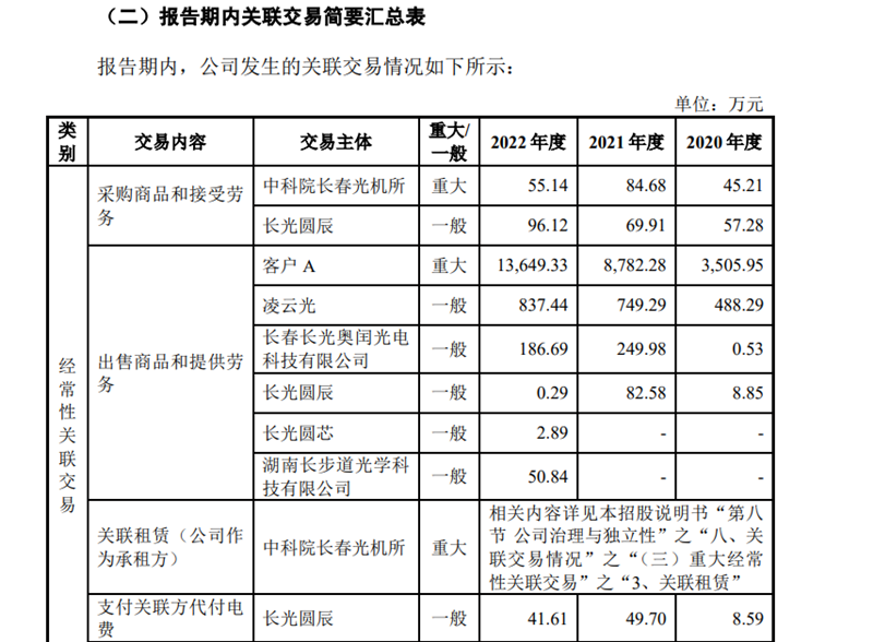 根据招股书显示。凌云光是长光辰芯成像芯片产品的客户之一,2020年至2022年双方关联交易规模逐年增加,分别为488.29万元、749.29万元、837.44万元。奥普光电历史上也曾为长光辰芯客户,2021年与长光辰芯的关联采购额为4.96万元,但2022年上半年,交易额已经为0。
