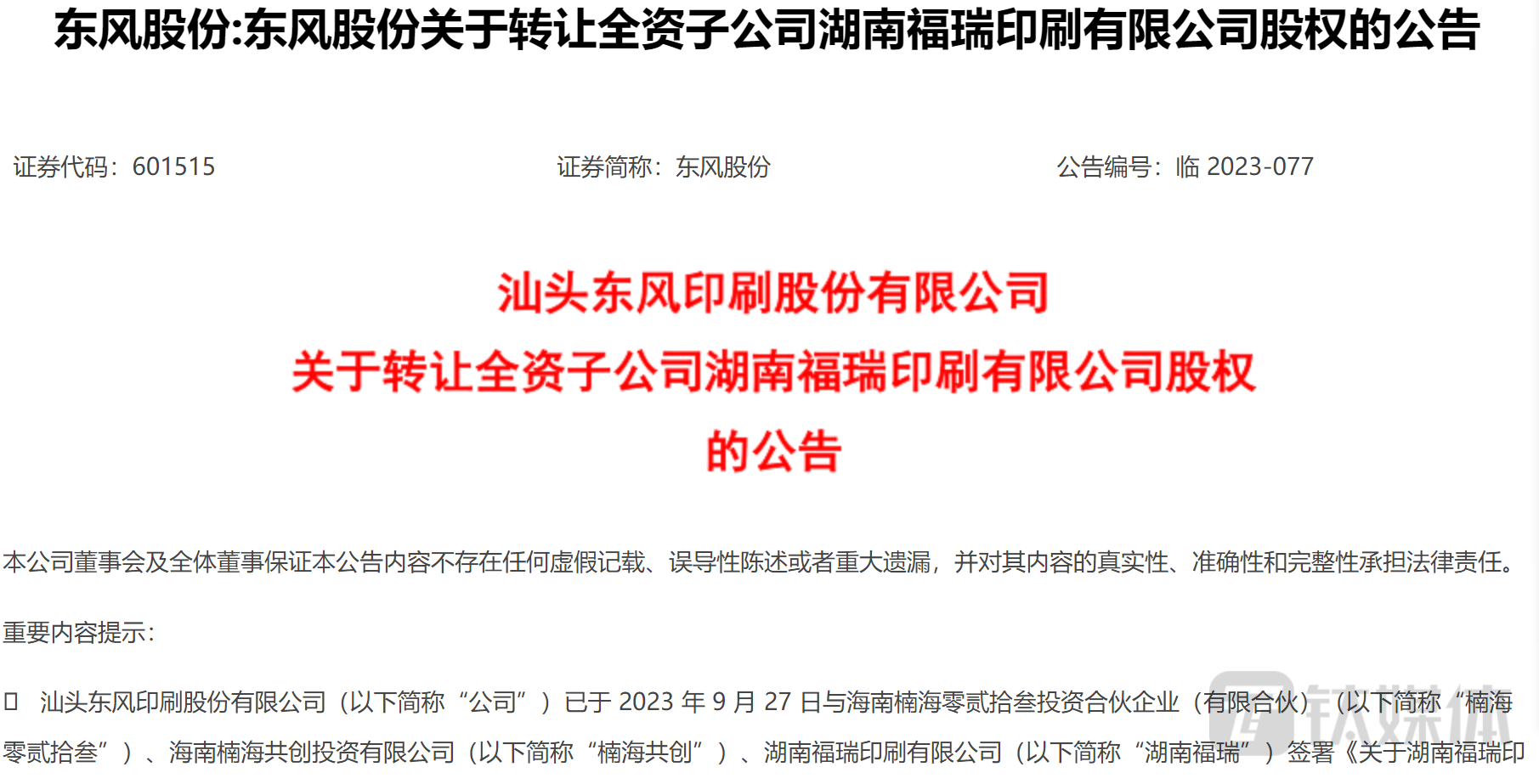 近日,东风股份(601515.SH)发布公告称,公司拟分别将持有的湖南福瑞印刷有限公司(下称“湖南福瑞”)99.5%、0.5%的股权转让给海南楠海零贰拾叁投资合伙企业(有限合伙)(下称“楠海零贰拾叁”)、海南楠海共创投资有限公司(下称“楠海共创”)。