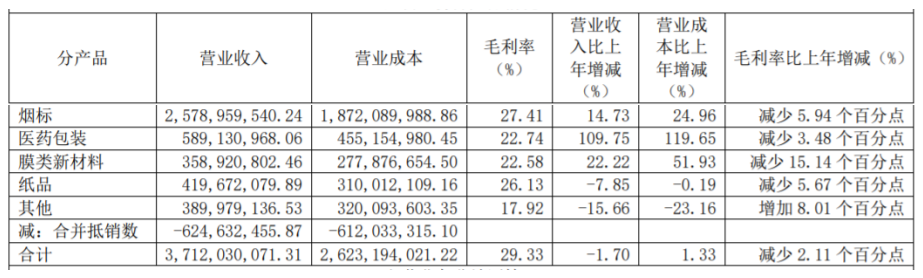 2022年,烟标业务收入占营业收入总额的68.88%,医药包装业务收入占比为15.74%,膜类新材料业务仅占9.59%。