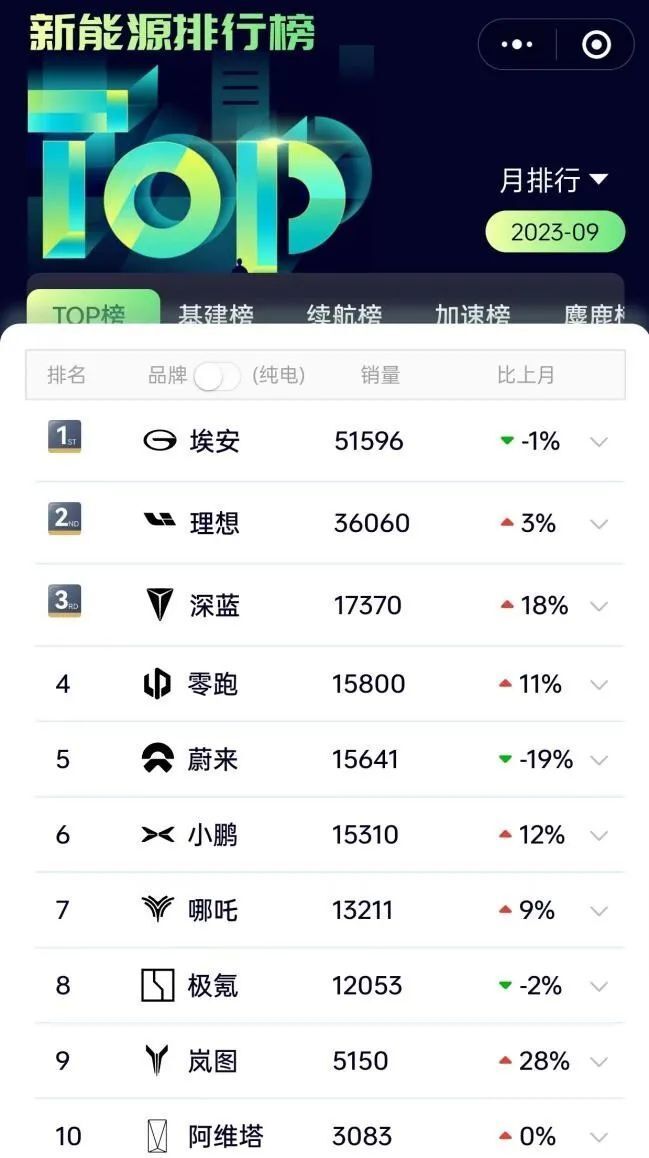 图/2023年9月新能源汽车销量排行榜,来源/新能源销量排行榜小程序,新能源行业观察截图
