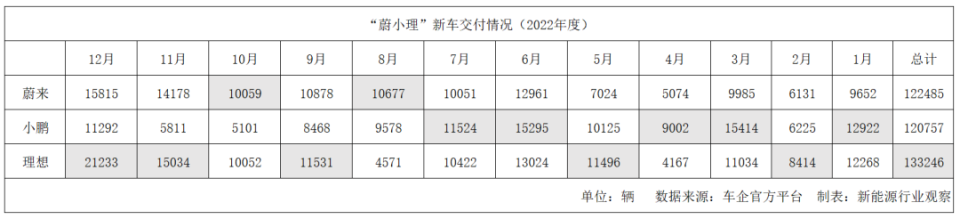 图/“蔚小理”新车交付情况(2022年度),来源/新能源行业观察制表