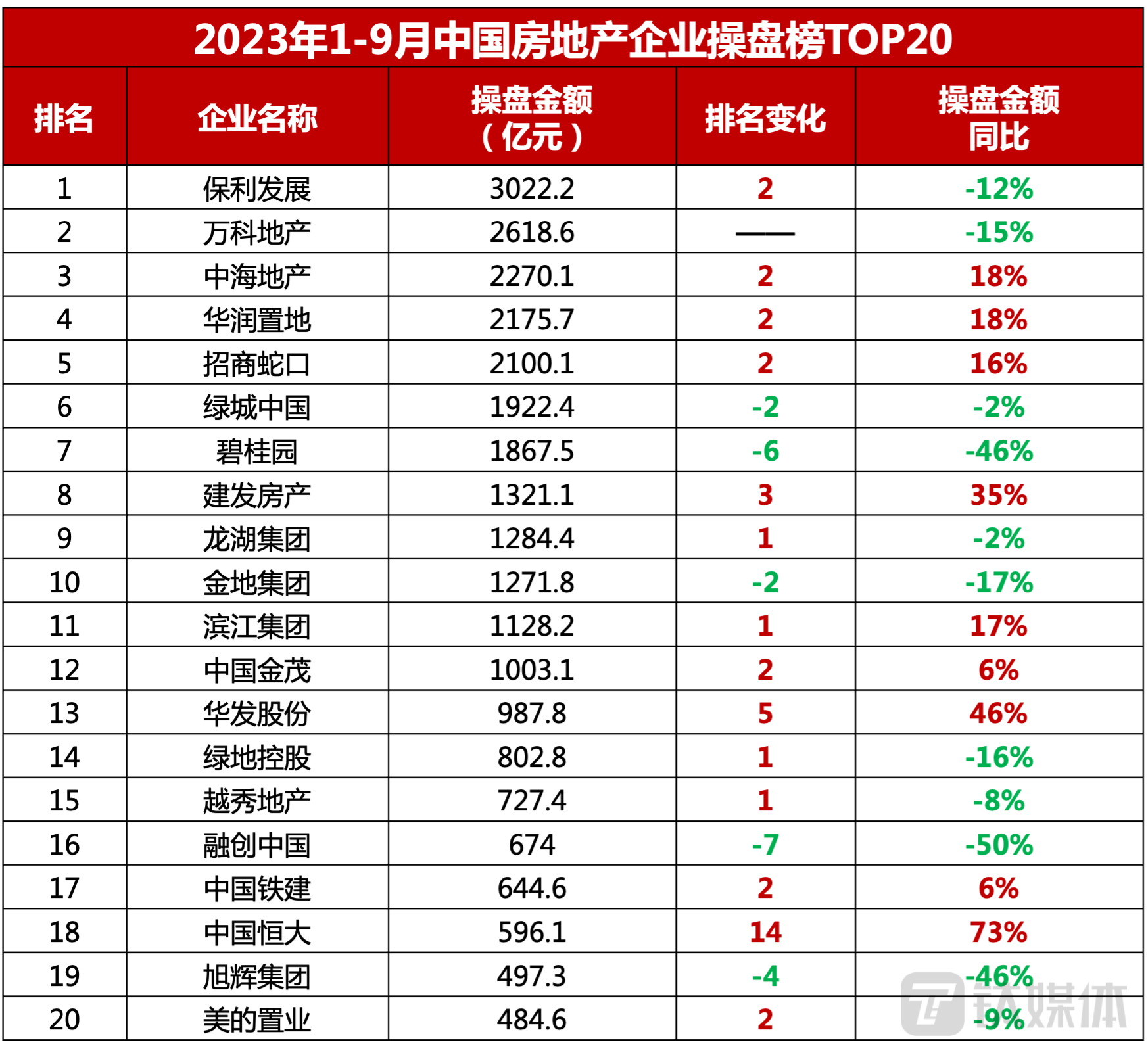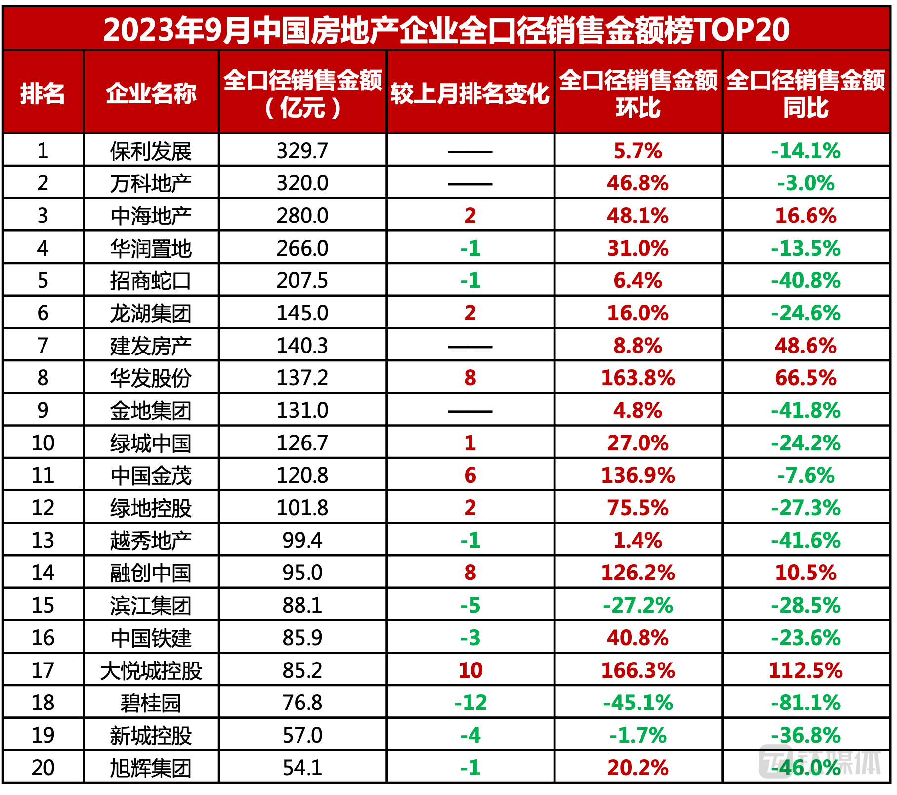 据最新发布的9月全口径销额榜单,保利、万科、中海分别位列榜单前三名且突破280亿,华润置地、招商蛇口突破200亿,分别位列第四、第五位。逾六成百强房企实现单月业绩环比增长,29家企业环比增幅超过3成。