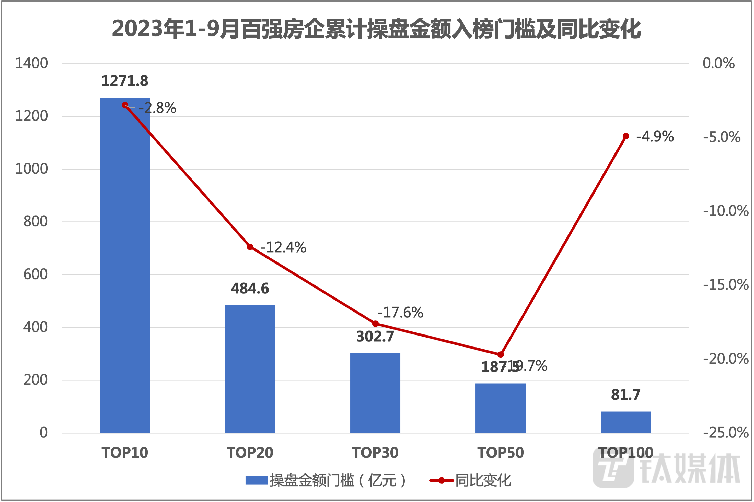 据克而瑞最新统计,从不同梯队房企销售门槛值的变化来看,2023年1-9月TOP10房企的销售操盘金额门槛同比降低2.8%至1271.8亿元,TOP20门槛降低12.4%至484.6亿元。TOP30和TOP50梯队房企格局变动加剧,门槛分别同比降低17.6%和19.7%至302.7亿元和187.5亿元。TOP100房企的销售操盘金额门槛则较去年同期降低4.9%至81.7亿元。2023年以来,百强房企格局持续分化,央国企及部分优质民企韧性较强、中小房企竞争力仍不足。