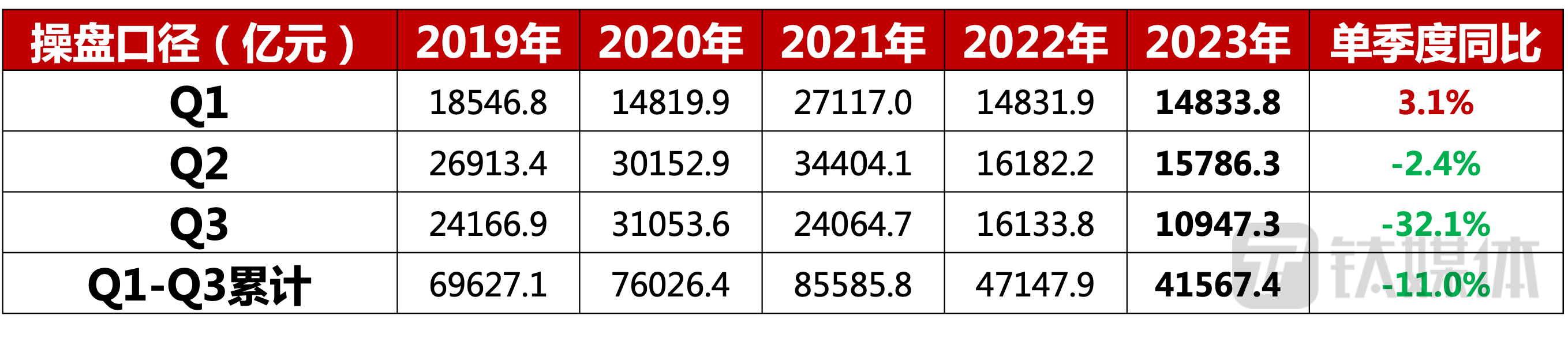 房企层面,据克而瑞最新统计, TOP100房企2023年9月单月操盘金额为4042.7亿元,环比提升17.9%,同比降低29.2%,同比降幅有所缩窄,但仍保持在高位。百强房企单月业绩规模延续下半年以来的低位。