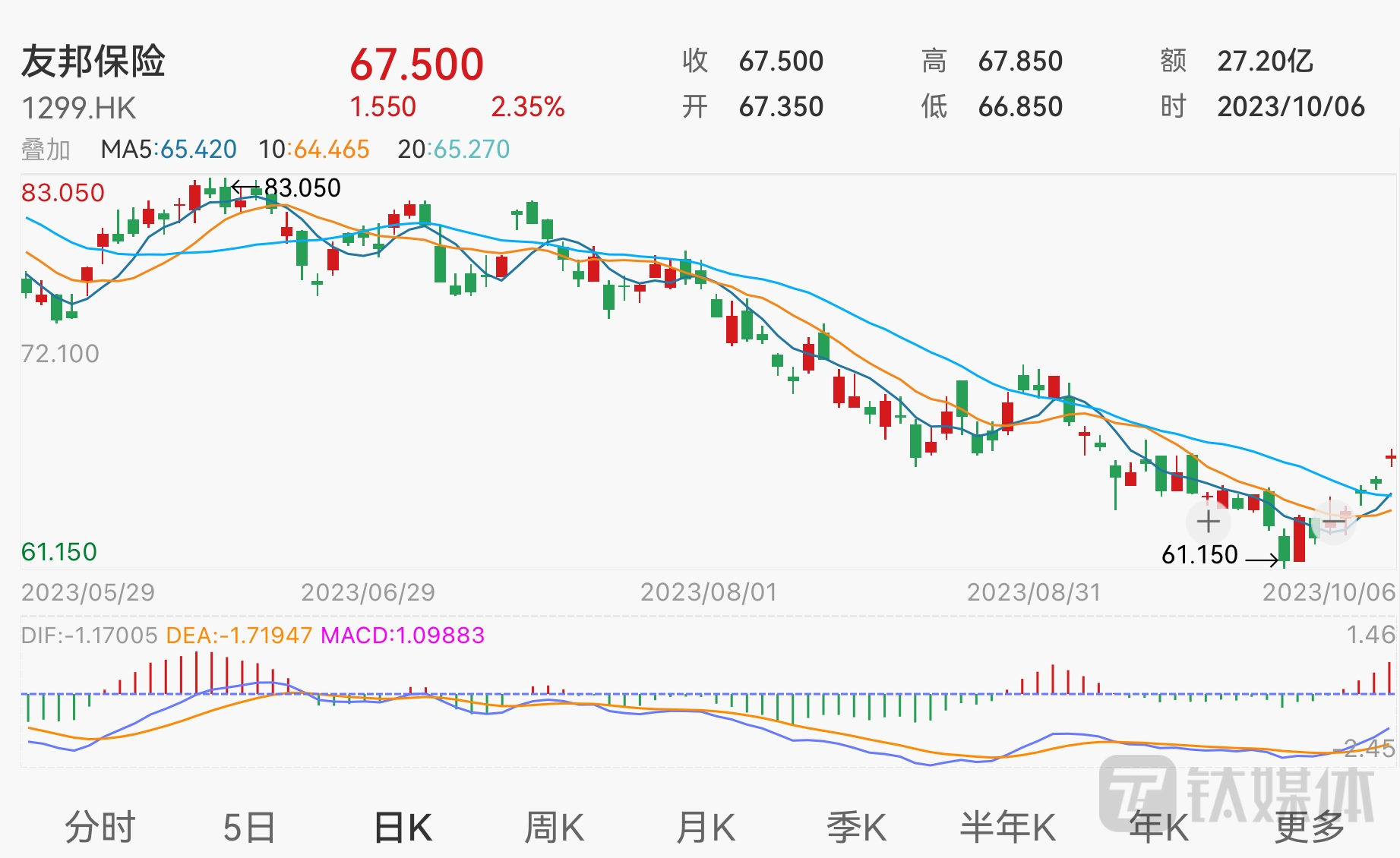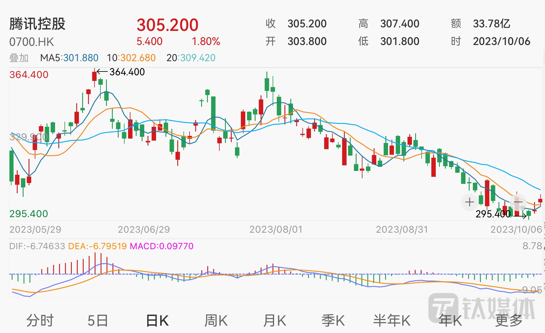 截至10月7日港股收盘,腾讯控股股价报收305.2港元,涨1.8%,成交额为33.78亿港元,当前公司总市值约2.91万亿港元;友邦保险股价报收67.5港元,涨2.35%,成交额为27.2亿港元,当前公司总市值约7774.42亿港元。![]()