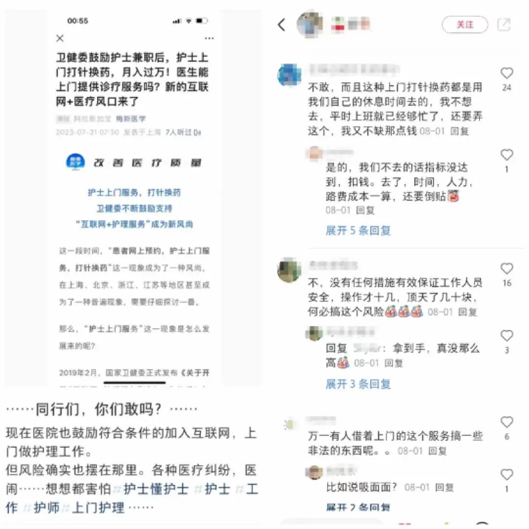 某小红书网友曾就“互联网+护理服务”的模式发文质疑,“上门护理,同行们,你们敢吗?”底下的评论区几乎成为护士群体的声讨现场,将近一百多条“不敢”浓缩了他们艰难的生存困境。