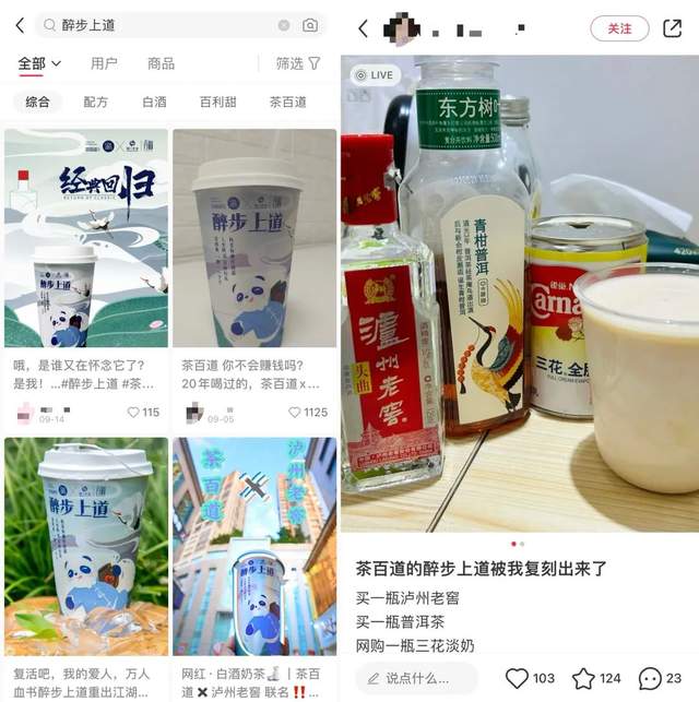 奶茶方面最成功的白酒联名当属泸州老窖与茶百道推出的「醉步上道」,2020年上线后即成为当时的王牌产品,而在今年酱香拿铁爆火后,不少用户都跑到茶百道的社交账号上要求重新上架「醉步上道」,小红书上更有不少网友自己买来了泸州老窖来复刻该款产品。