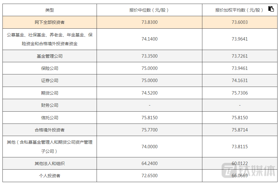 可见,基金、保险、证券、期货、信托对浙江国祥此次IPO申购的报价加权平均数均超过了73元/股。