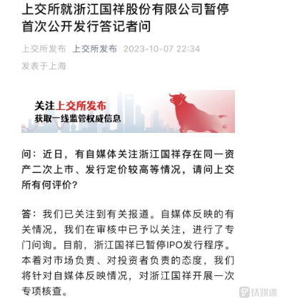 随后,上交所也对浙江国祥的事件进行了相关回复,并表示目前浙江国祥已暂定IPO发行程序。本着对市场负责、对投资者负责的态度,我们将对自媒体反映情况,对浙江国祥开展一次专项核查。
