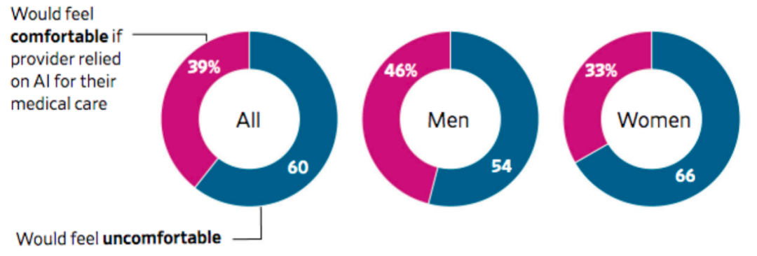 显然,大部分患者也对AI医生也是将信将疑。在一项针对美国成年人的调查中,66%的女性和54%的男性都不太放心AI提供的医疗服务。