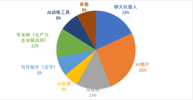 我们发现,按功能来看,针对视频、音频、图片、文字的 AI 工具是占比最高的产品。而细分下来,AI 生图或修图工具的占比最高,一共有 13 款产品,是开发者们相对钟爱、目前看来也是 C 端用户愿意尝试的产品类型。