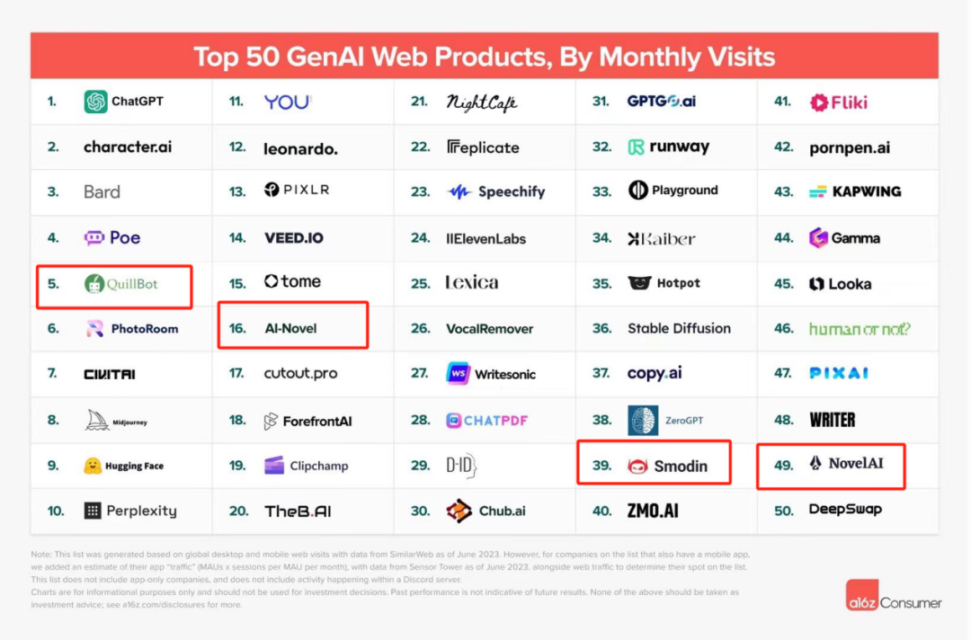 a16z 对面向 C 端开放的 AI 产品流量 Top50 的排名|注 1:排名数据主要参考的是 SimilarWeb 截至 2023 年 6 月的网站流量数据,对于有移动端 App 的产品 a16z 也估算(方法为 MAU 乘以每个用户平均月访问次数)了流量数据与网站数据一并进行了统计。
