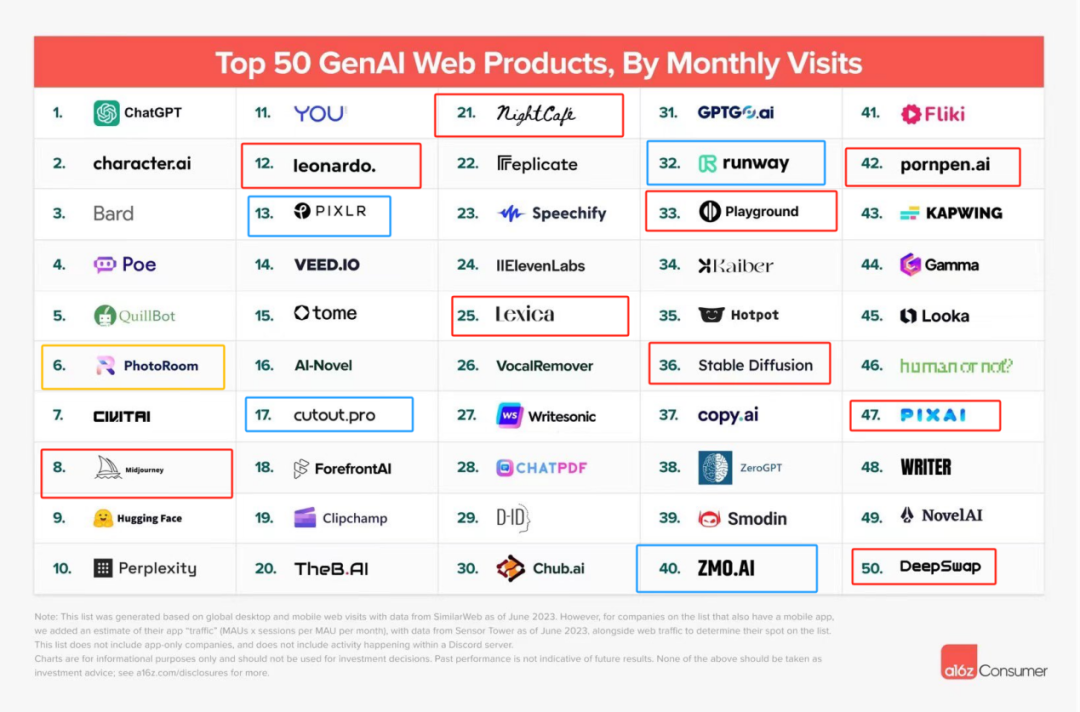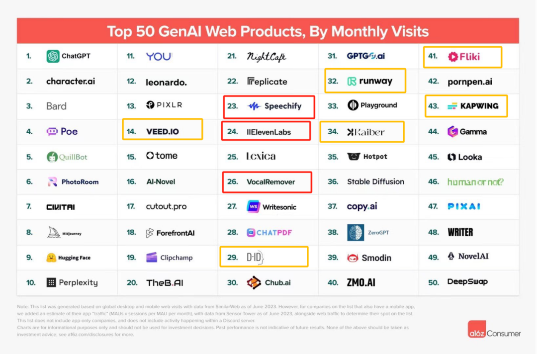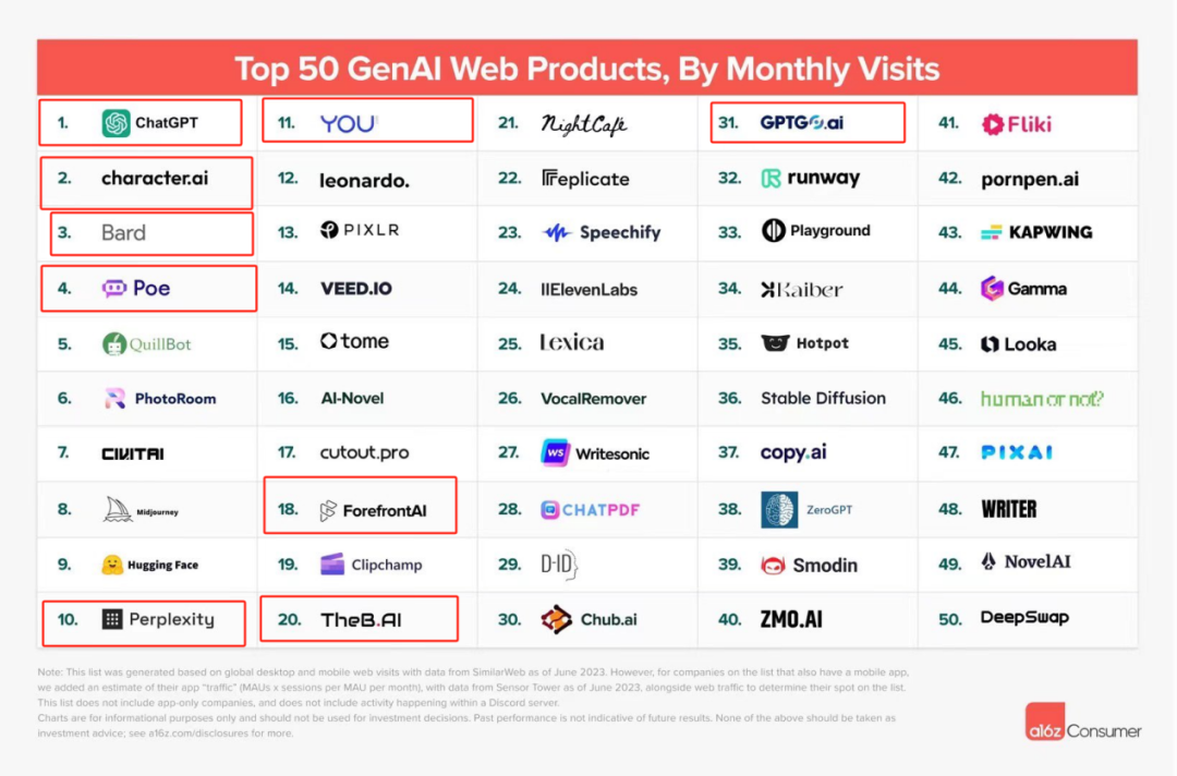 而最近,美国知名科技风投公司 a16z 对目前市场上流量最高的 50 款面向 C 端用户开放的 AI 产品进行了排名,参考这份排名,本文刚好就上述角度做一次观察。