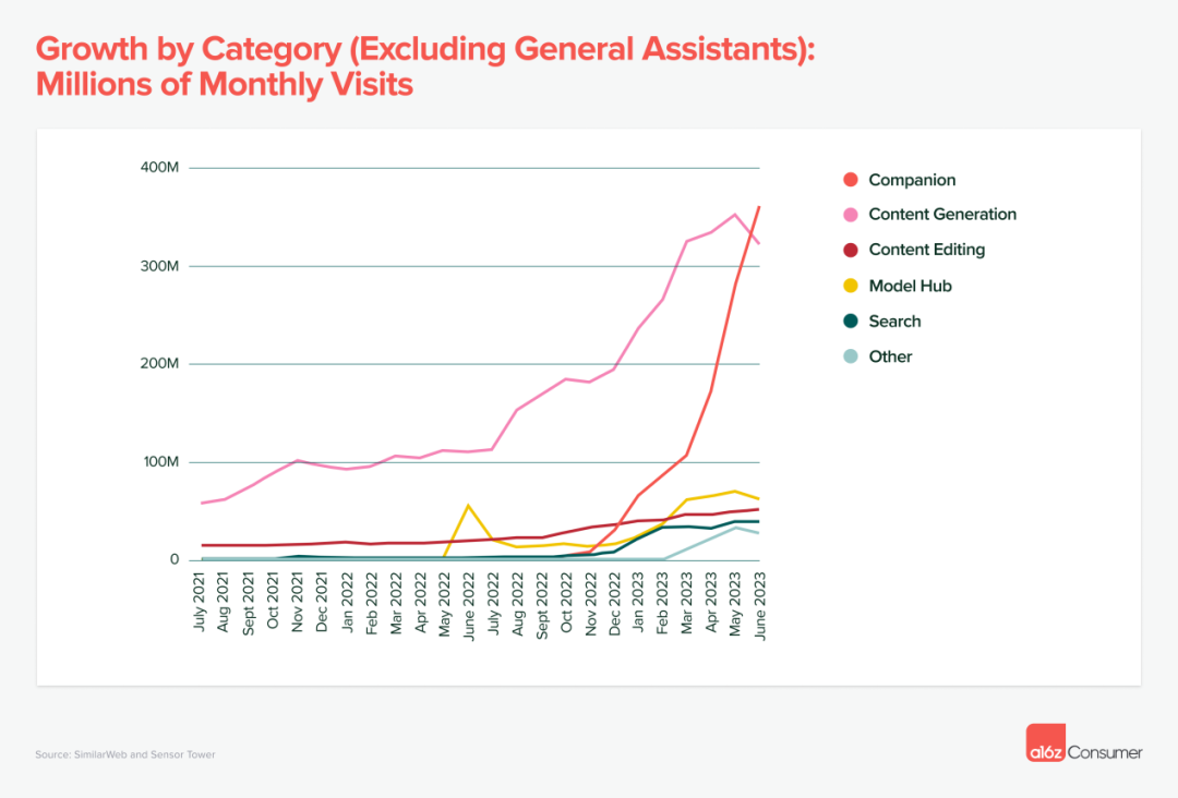 三、抛开 ChatGPT 和它的模仿者之外,流量增速最快的是 AI 伴侣和 AI 内容工具(这也是出海创业者们最常做的 2 个赛道)。