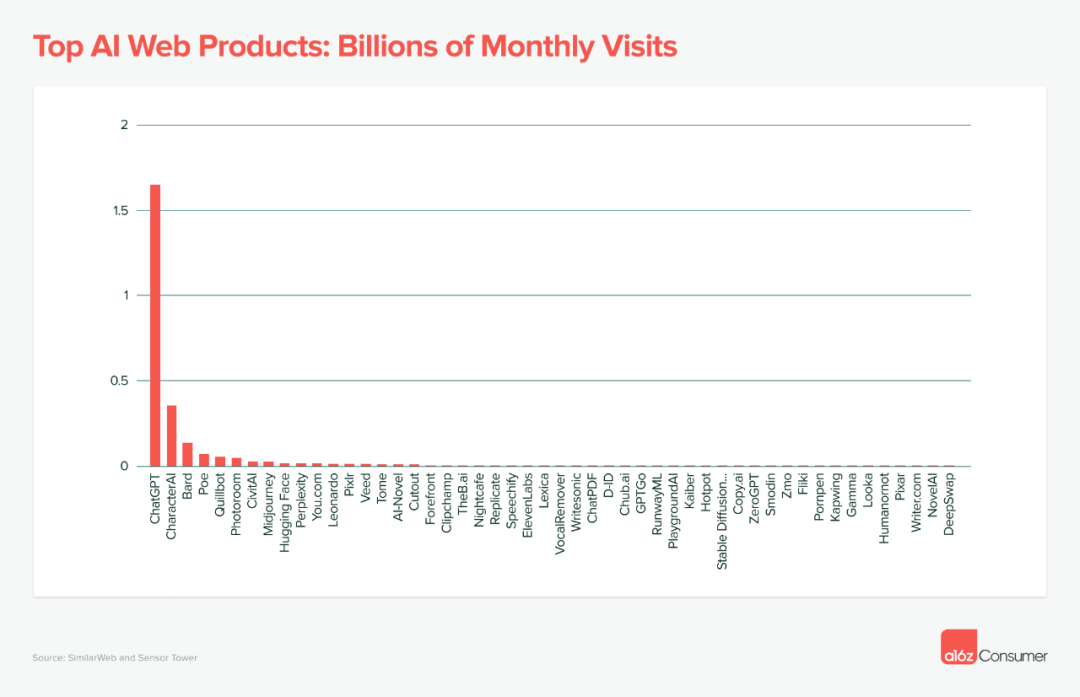 ChatGPT 与其他主流产品流量对比|图片来源:a16z
