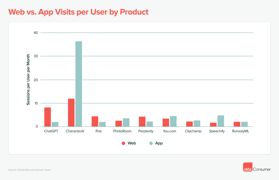 各款产品网站端和 App 端流量对比 | 图片来源:a16z