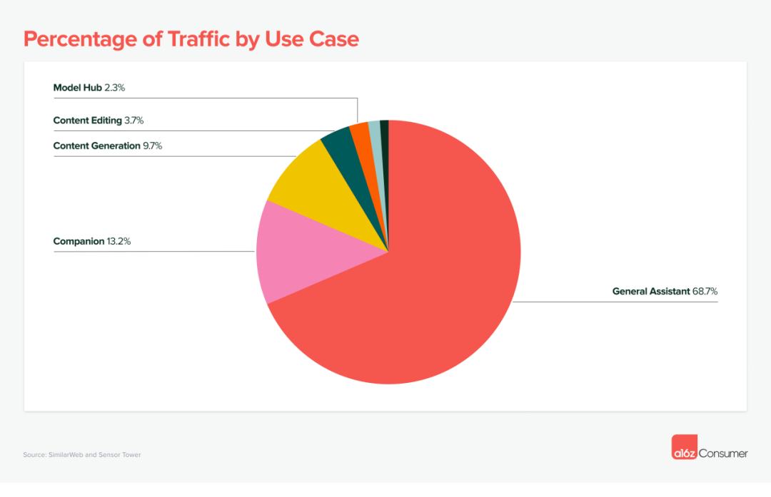AI 产品的流量占比数据及除 AI 助手工具外其他类别的增长情况|图片来源:a16z
