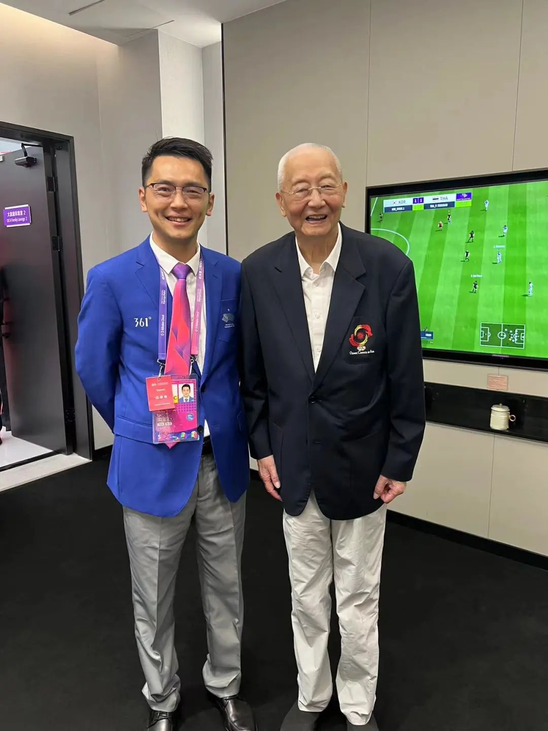 杨森(左)与魏纪中先生在杭州亚运会比赛现场。图片由受访者提供。