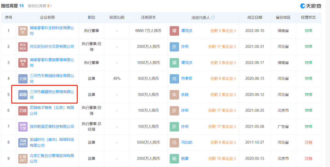 此外,许莉还任天洋控股旗下三河市嘉融物业管理有限公司监事、并曾担任天洋控股旗下三河市梦东方文化投资有限公司监事。