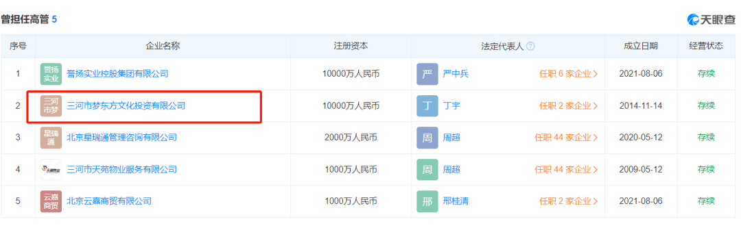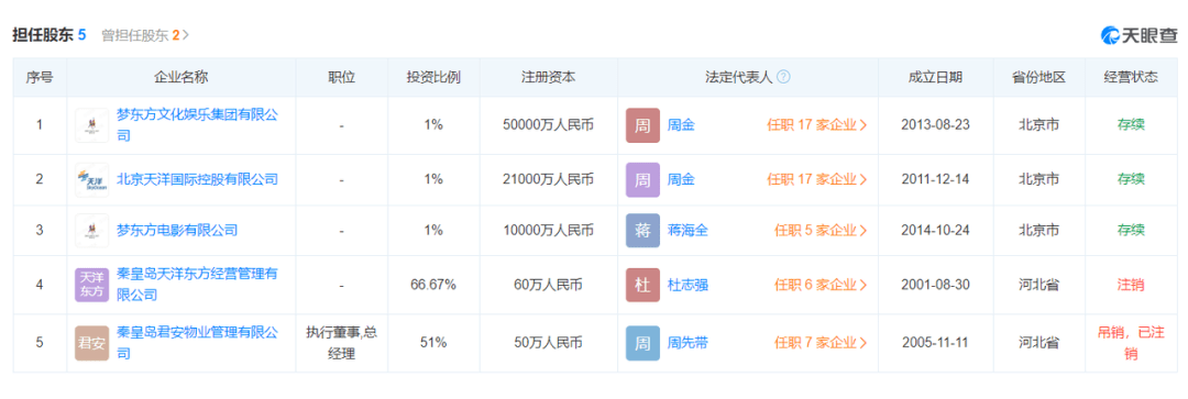 周先带则为北京天洋国际控股有限公司股东,同时是旗下梦东方文化娱乐集团有限公司、梦东方电影有限公司股东。