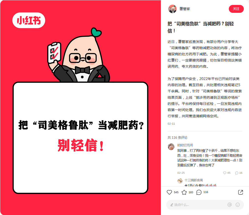 被黄牛刷屏的相关社交平台紧急出面提醒:司美格鲁肽注射液只是用来治疗糖尿病的处方药,切勿盲目相信部分“将处方药用于减肥”“错误用药、夸大药效”的帖子,就诊请到正规医疗场所。