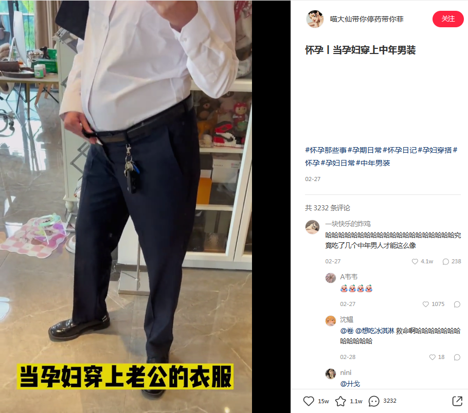 小红书美妆博主怀孕时“喵大仙”扮演中年男性。她甚至不需要做什么,只需要穿上男装,衬衫皮带钥匙扣再夹上公文包,当然还有灵魂的啤酒肚,油腻感就扑面而来。