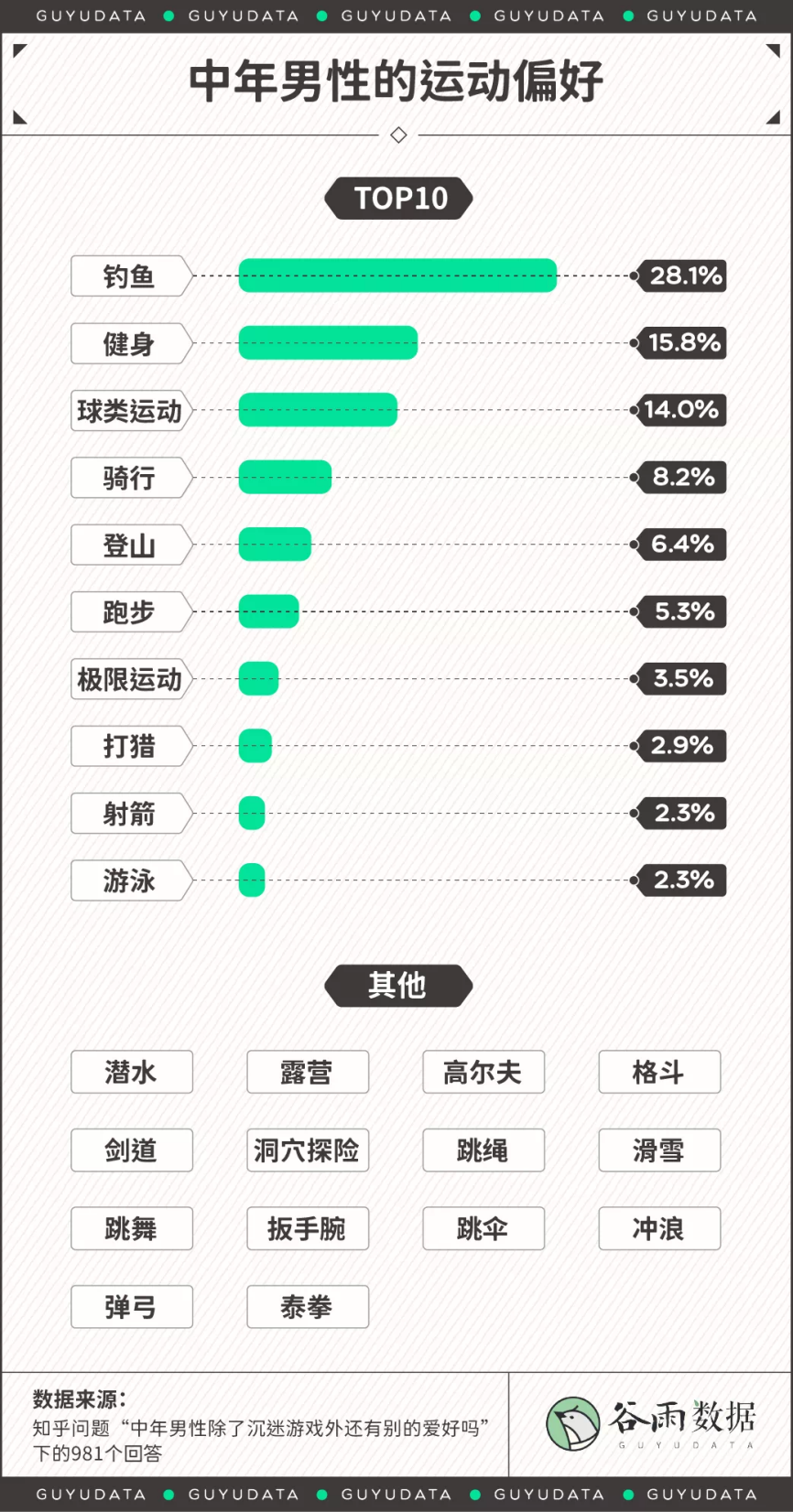 其中,热度最高的还是钓鱼,受欢迎程度差不多是健身(15.8%)和球类运动(14%)的总和。