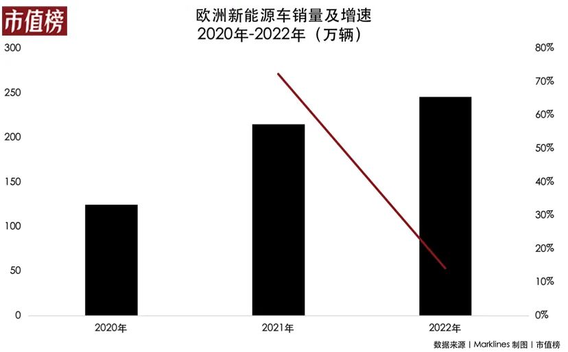 相关数据显示,2022年欧洲市场共销售了238万辆新能源汽车,其中有54.9万辆产自中国。相当于,欧洲每销售约4辆新能源车,就有1辆产自中国。