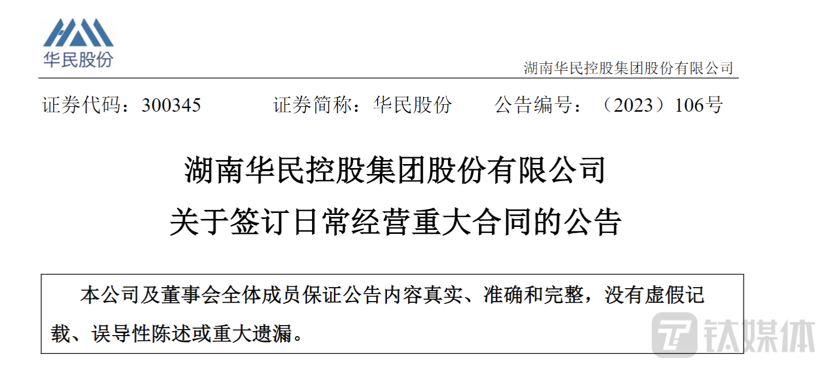 10月8日,华民股份(300345.SZ)发布关于签订日常经营重大合同的公告,称公司及控股子公司鸿新新能源科技(云南)有限公司(下称鸿新新能源)与通威股份(600438.SH)旗下6家公司共签订两项合同,合同金额共近100亿元。