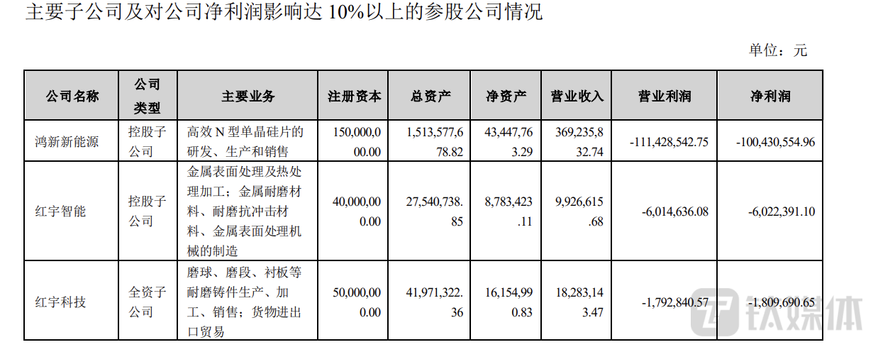 今年上半年,鸿新新能源营业收入大幅增加,为3.69亿元,但其亏损程度却扩大,净利润为-1亿元。华民股份称其亏损的主要原因为今年上半年,受光伏行业波动影响,硅料、硅片价格持续走低,鸿新新能源6月末计提存货跌价损失1.03亿元,致其亏损较大。