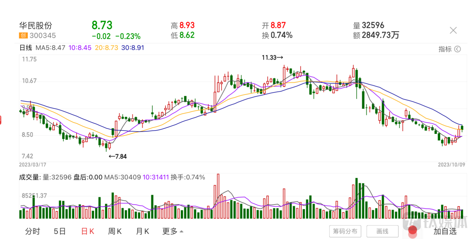 二级市场方面,华民股份高开低走,截至10月9日收盘,公司股价报收8.73元,跌0.23%,当前总市值为50.42亿元。