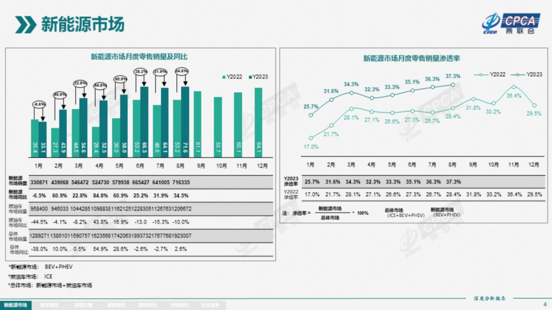 去年,国内新能源渗透率曾出现过大幅增长,最高点增长接近20个百分点,但在十一月之后,受到政策收紧以及燃油车大幅降价影响,渗透率又连续两个月大幅下跌。随着新能源车企开启价格战,直至今年7月渗透率才恢复到去年同一水平。