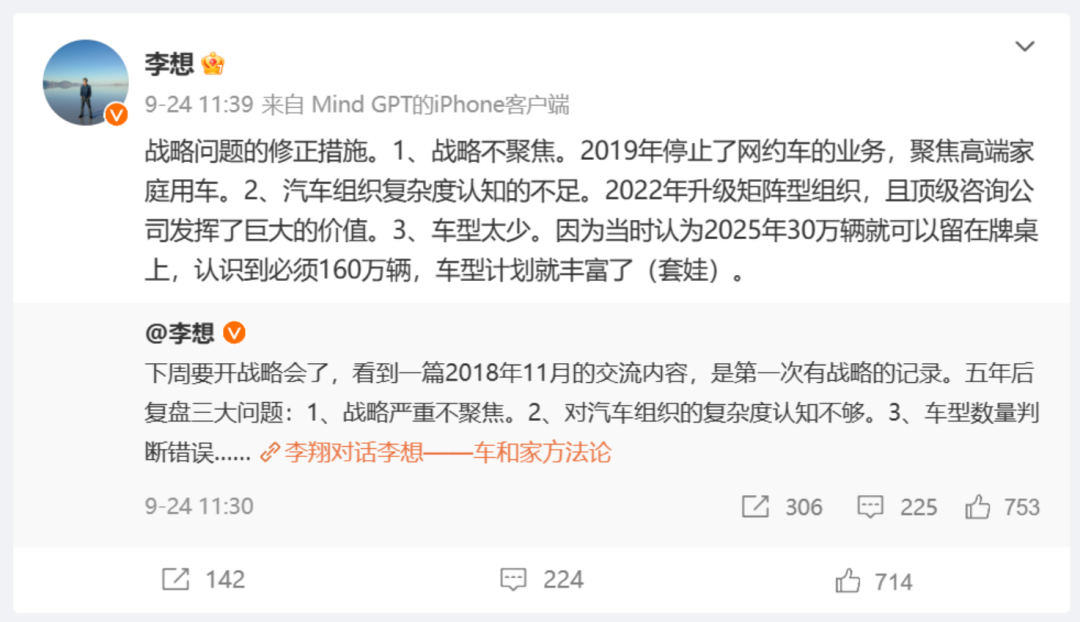 于是乎,李想时常在微博上的反思也就很好理解了。