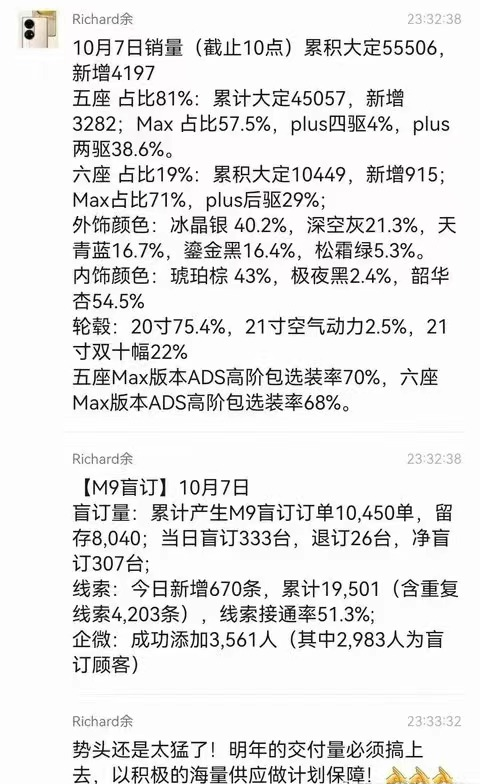 根据余承东披露数据,问界新M7大定订单已超过5万辆,对比问界今年前9个月累计只有4万左右的交付成绩,新M7凭一己之力,已经超过了问界整个品牌大半年的努力。
