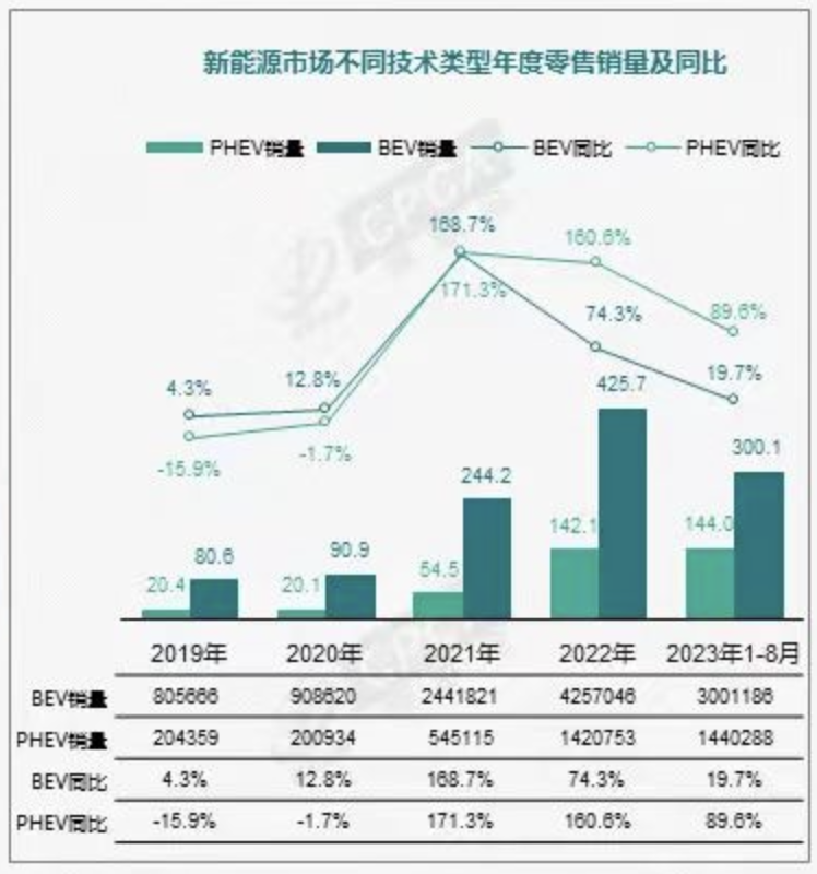 研发增程式车型,正成为当下电动汽车领域的新趋势。根据乘联会数据,自2021年以来,包括增程式产品在内的混动车型,增速开始反超纯电车型,并保持至今。2023年1月-8月,混动车型销量同比增长89.6%,远高于同期纯电车型的19.7%。