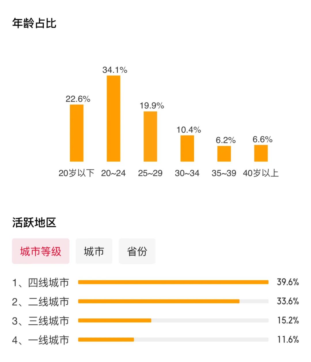 根据猫眼专业版数据,《前任3》的用户画像显示,四线城市占比最高,达到了39.6%。年龄占比中,20-24岁的年轻人最高,达34.1%。