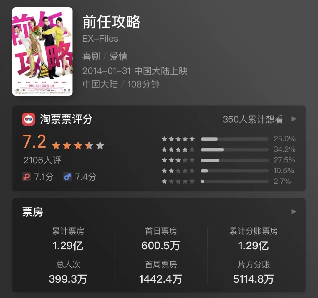 当时电影还没做完,制片人就决定定档春节,虽然排片率只有5%,但靠着长线口碑,《前任攻略》拿下1.29亿的票房。
