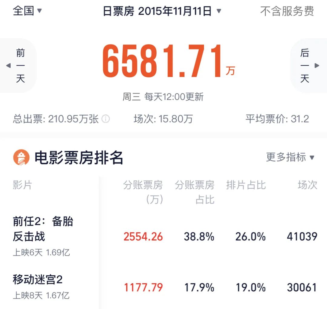 《前任2》定档小光棍节“11.1”,上映三天票房过亿,不到十天票房破2亿,连续拿下单日票房冠军。在光棍节当天,上座率、排片率、人次、票房各项第一,成为大满贯得主,各方面数据超越《前任攻略》,并且顶住了同档期好莱坞大片《007:幽灵党》《移动迷宫2》的压力。