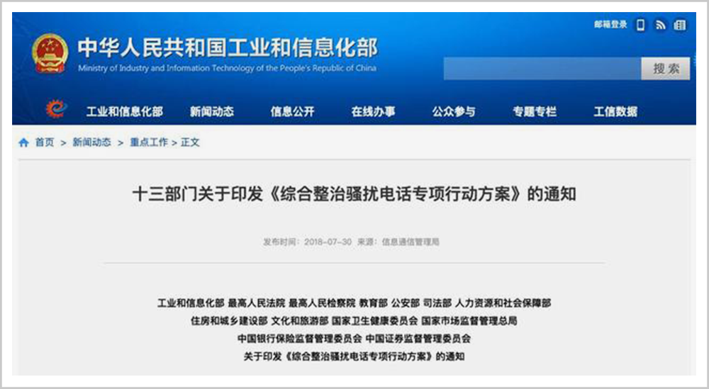 7月,联合13个部门发布《综合整治骚扰电话专项行动方案》;11月,再发《关于推进综合整治骚扰电话专项行动的工作方案》。