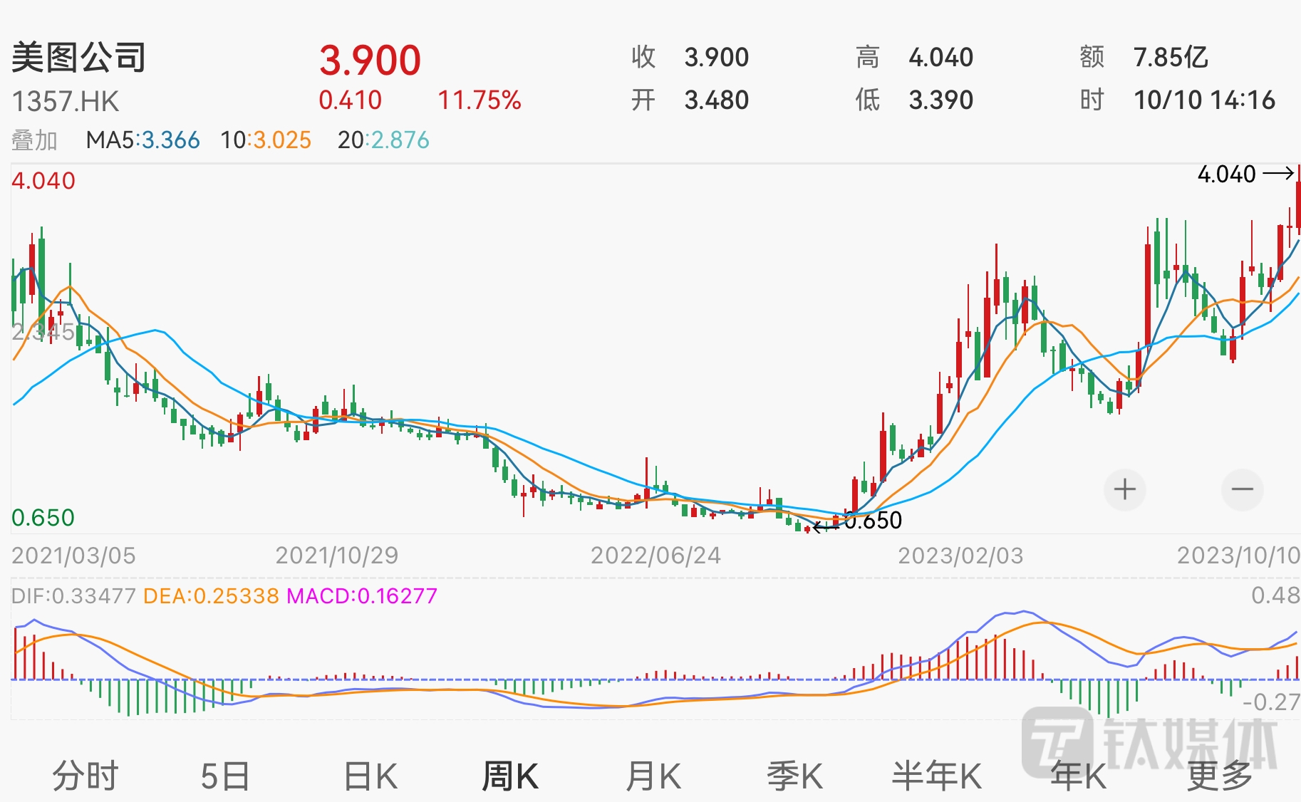 截至发稿前,美图公司股价报3.9港元,涨12.72%,成交额为6.16亿港元,当前公司总市值约173.43亿港元。