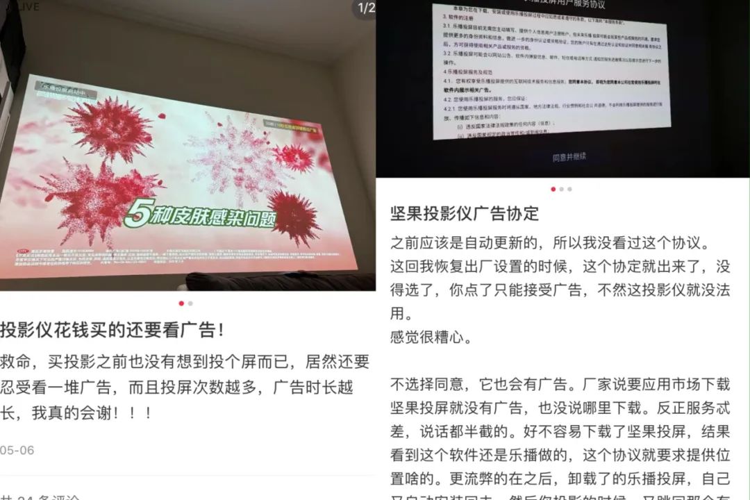 此外,还有网友早在2020年于小红书上指出,坚果投影仪的乐播投屏用户服务协议“点了(同意)只能接受广告,不然投影仪就没法用,不选择同意,它也会有广告。厂家说要应用市场下载坚果投屏就没有广告……好不容易下载了坚果投屏,结果看到这个软件还是乐播做的……最牛的是卸载了的乐播投屏,它自己又会自动安装回去,然后你投影时,又跳回那个有广告的乐播投屏。”