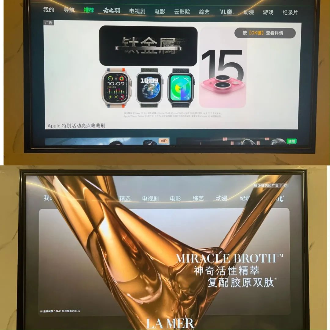 按下电视的开机键,首先出现的画面是开机广告,再随便点开一个影片,视频播放前又会出现广告,好不容易开始播放影片,时不时还会跳出各种广告且不可关闭,提示开通会员后方可跳过广告,但办理会员后仍要手动跳广告……