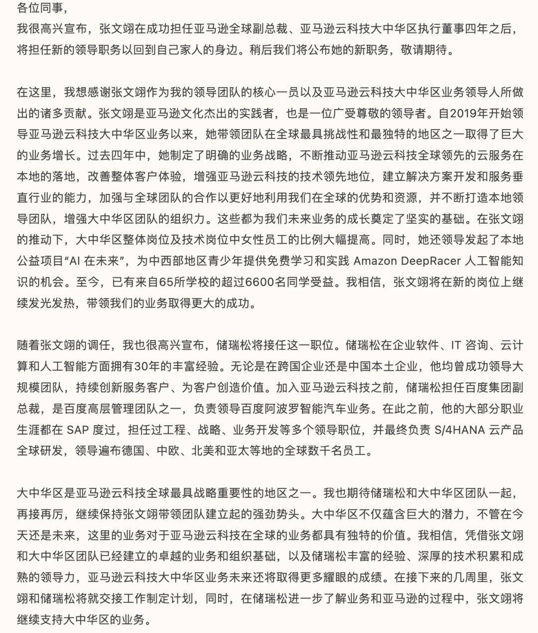 据了解,张文翊从2019年开始领导亚马云科技大中华区业务,在其任职期间,制定了“连中外、襄百业、促绿色”的三大业务战略,并持续推动大中华区的合作伙伴体系;而储瑞松则曾经任职于百度阿波罗和SAP等公司,担任过新业务、新战略的核心主力。