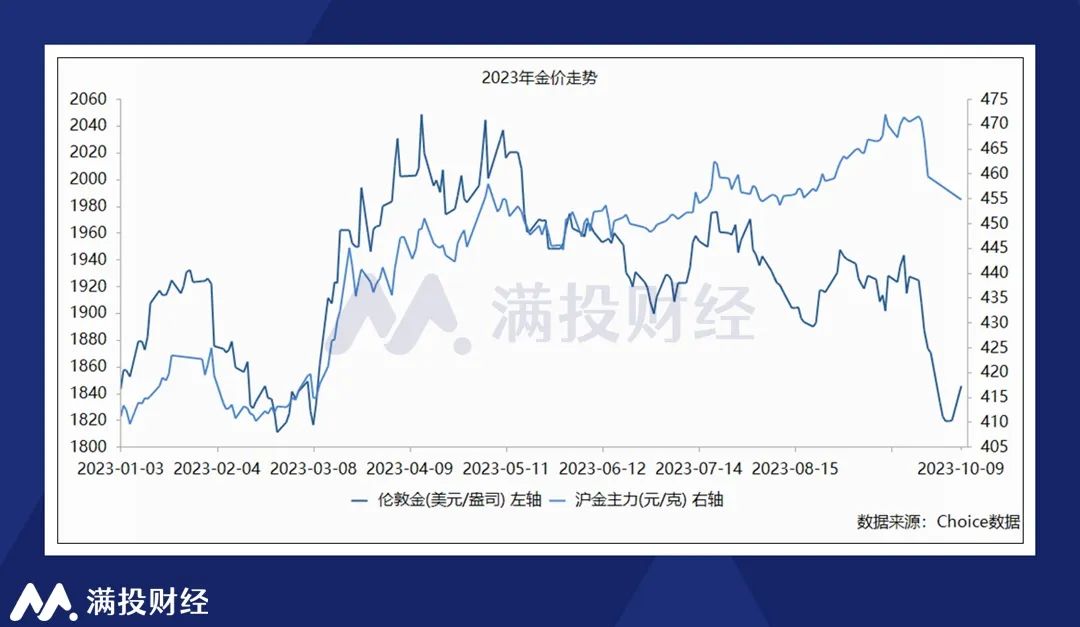 与美元指数近期的强势不同,黄金价格在9月末就开启了大跳水,近期跌幅在全球大类资产中都名列前茅。以伦敦金为例,自9月25日起连续9个交易日下跌,累计跌幅超5%;截至10月6日,伦敦金报收1819.60盎司/美元,为近7个月的低点。国际金价的连续回调,也导致国内金价下跌。