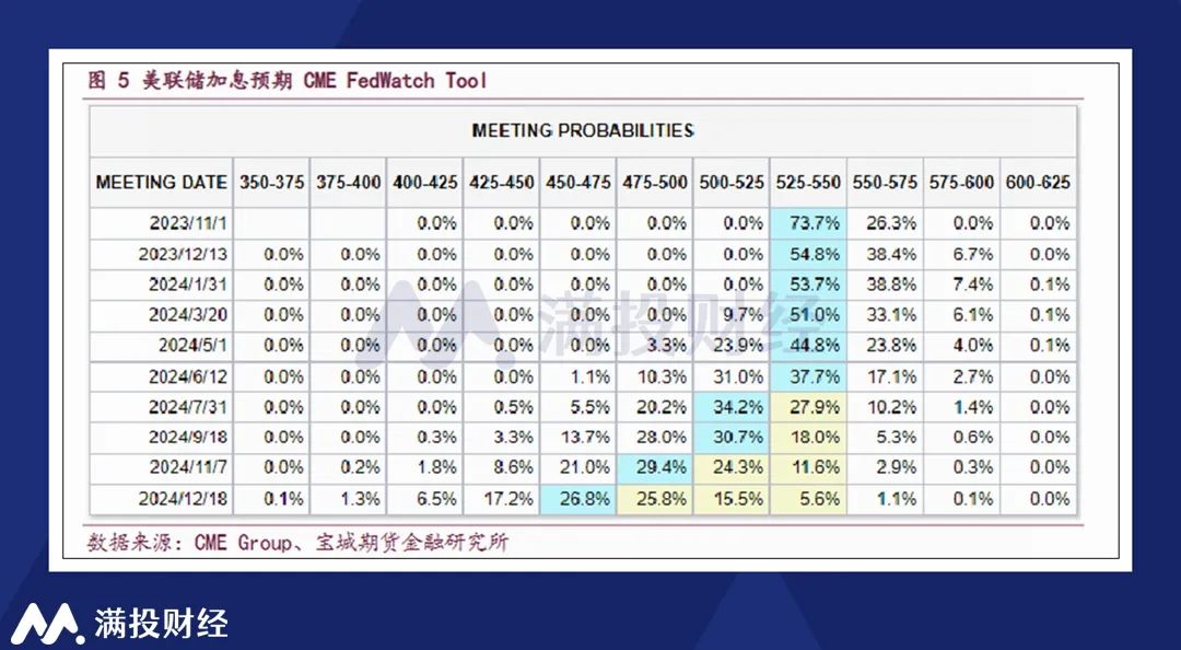 近期美联储9月议息会议落地,11月加息25个基点预期概率提升,而降息预期由2024年6月推迟至2024年7月。此外,近期多位美联储官员发表鹰派言论,表示年内可能进一步提高利率,并将在未来一段时间维持在较高水平。