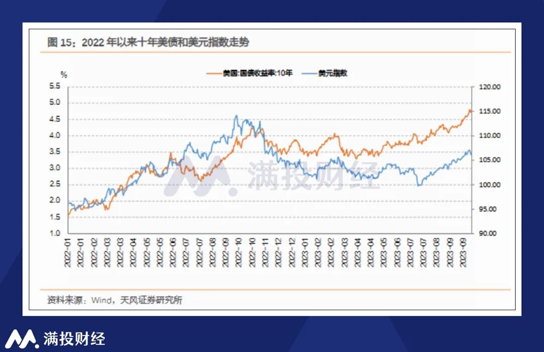 PMI的改善和劳动力市场的坚韧都让美国陷入经济衰退的可能性有所降低。美国经济软着陆预期的共识在不断凝聚,这让市场对美国经济衰退的担忧减弱,黄金作为避险资产的吸引力下降,将给金价的上涨造成一定的阻碍。同时,美国经济的强势表现下,美元指数的走强和美债利率的回升抑制黄金价格走势。