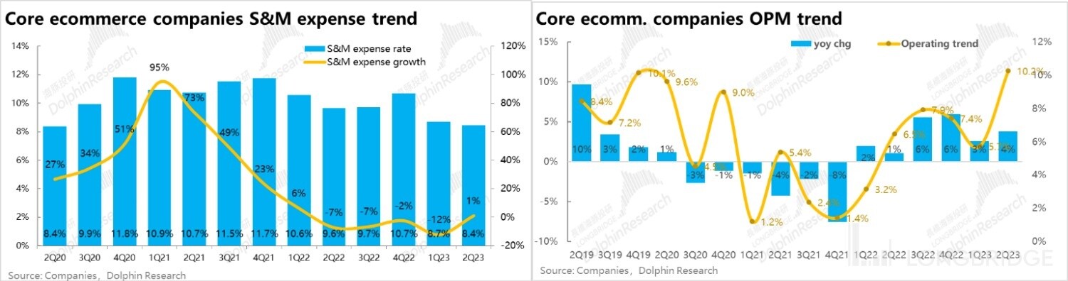 而利润层面,二季度重点泛电商公司的总经营利润率不仅没有恶化,反而显著提升到了 10.2%,甚至已高于疫情前 2019 年的水平。