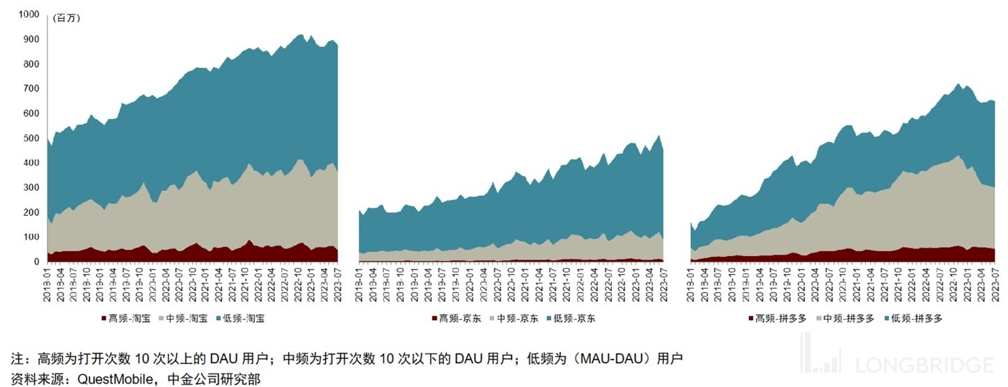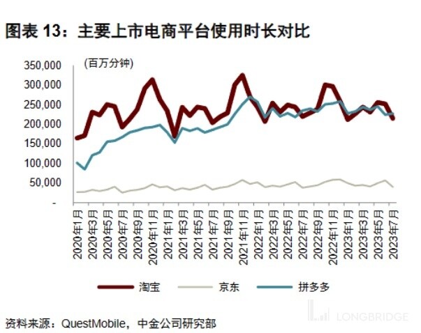 因此从高频用户数和但用户使用时长的角度来看,拼多多和 GMV 规模两倍与自身淘宝近乎是并驾齐驱的,而京东则显著落后。换言之,淘宝&京东仍有要追赶的距离。