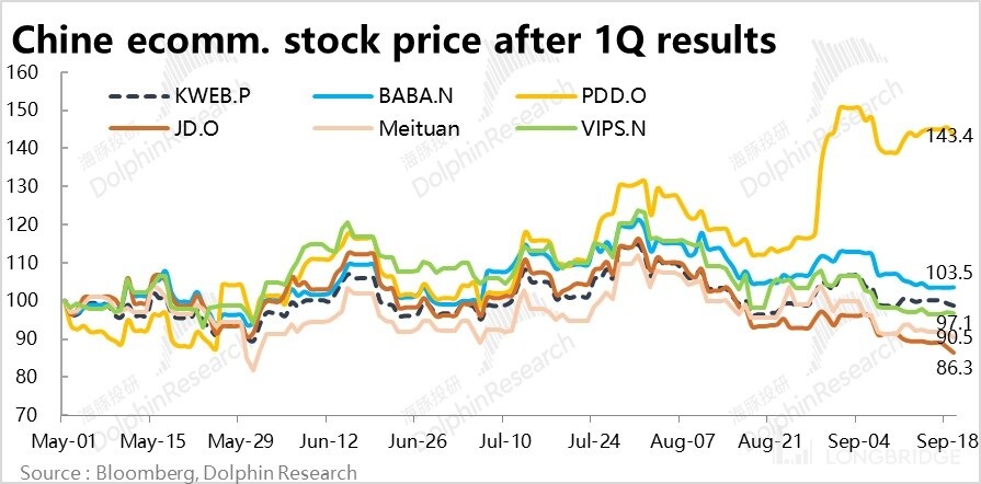 以 5 月 1 日为界,回归一季度业绩期后至今,我们覆盖的国内泛电商公司的股价表现,除了一只独秀的拼多多和勉强跑出正收益的阿里集团外,其他各家股价不仅都是下跌的,且也都跑输了中概金龙指数同期的走势。即便不愿也无法否认,在过去的近 5 个月内,国内泛电商公司在绝对收益和相对收益上两个维度上的表现都是偏弱的。