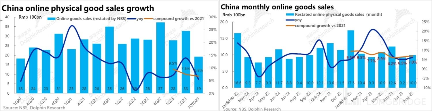 1.1 首先从线上零售大盘的增长来看,按 2021 年~23 年的两年复合增速,国内线上实物零售大盘增速在今年的前三个季度(3Q 截至 8 月)内呈单边放缓的趋势,增速依次为 9.5%、7.5%、和 6.8%,行业景气度清晰可见的越来越差。